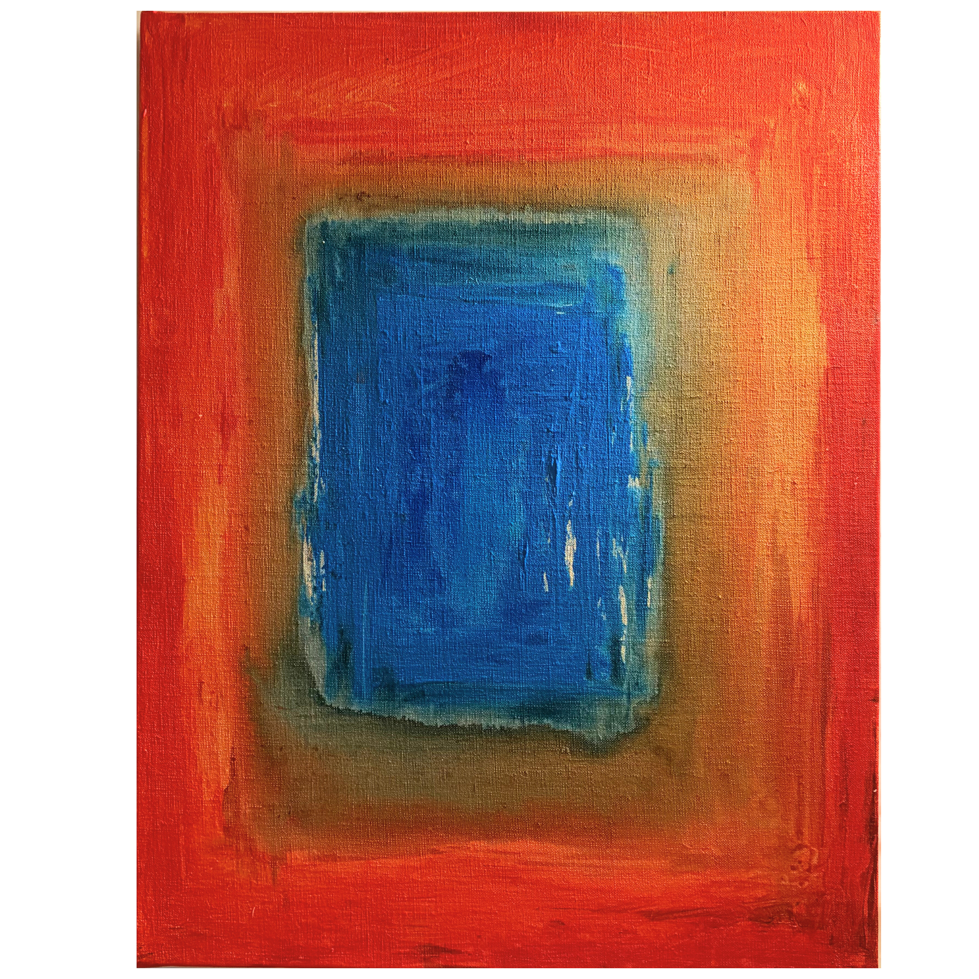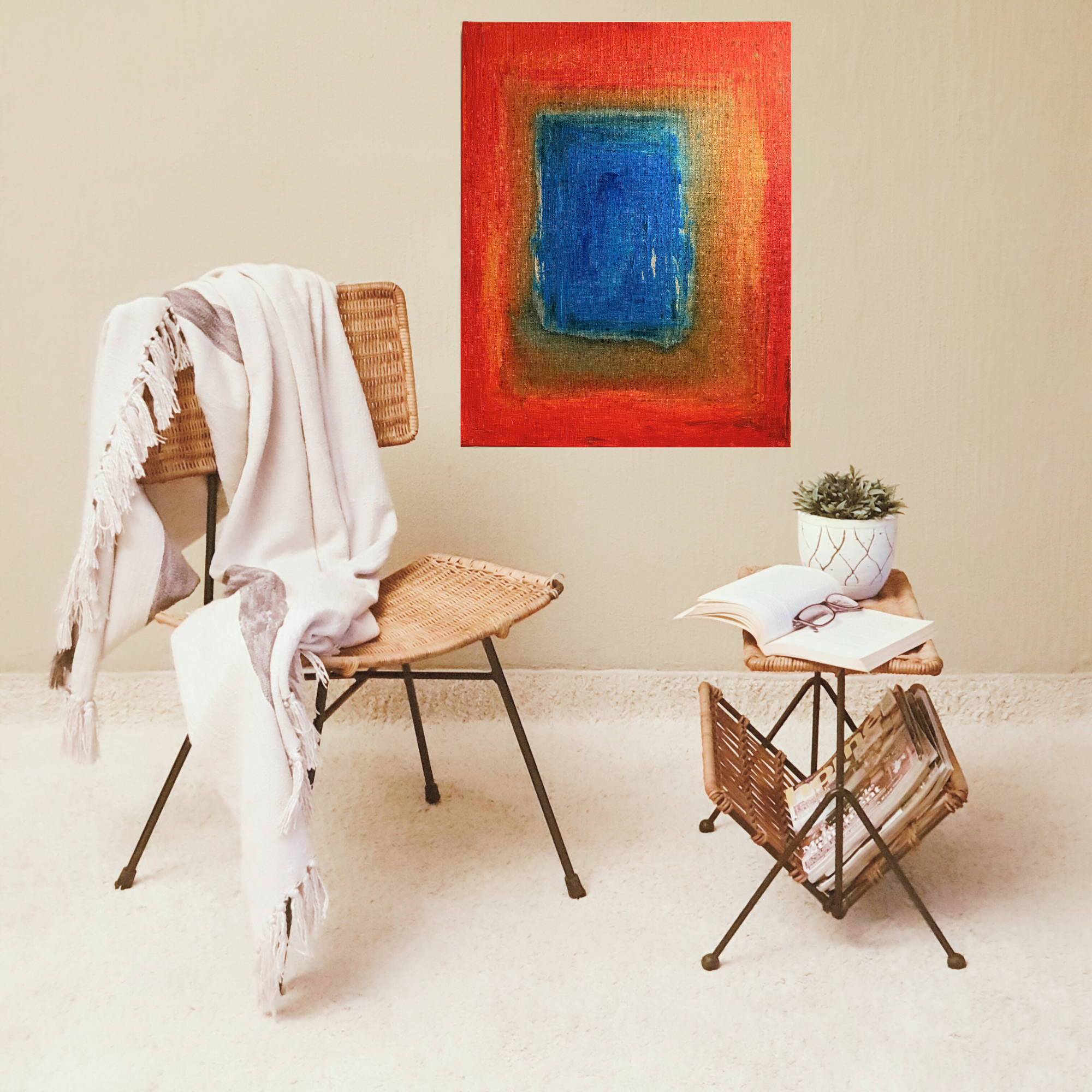 温かみのある光のように広がるオレンジの奥に、静かに佇む深いブルー。